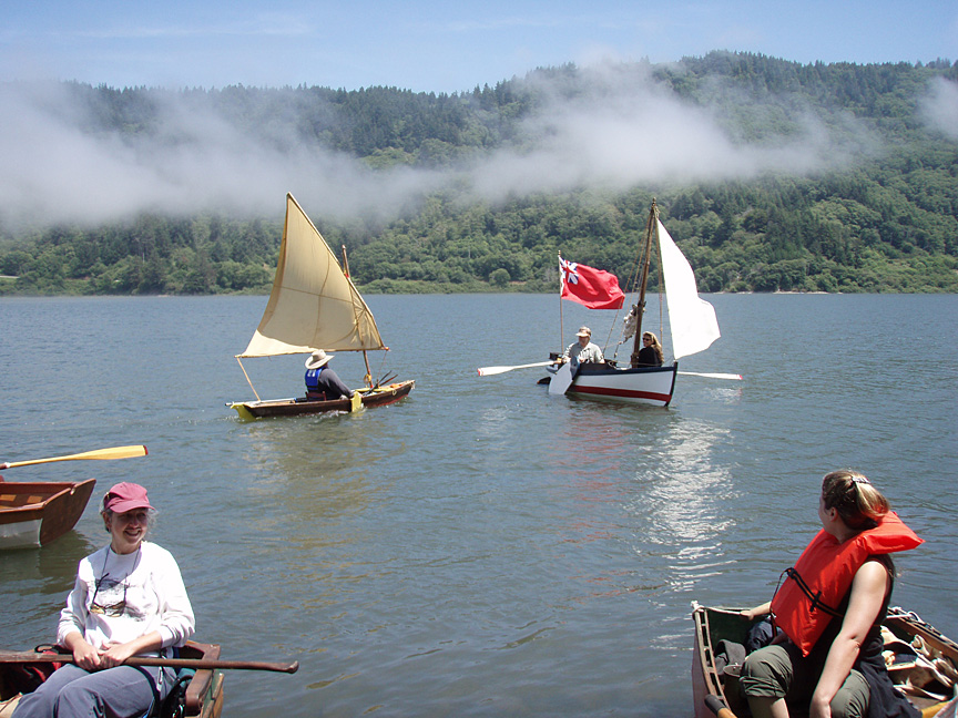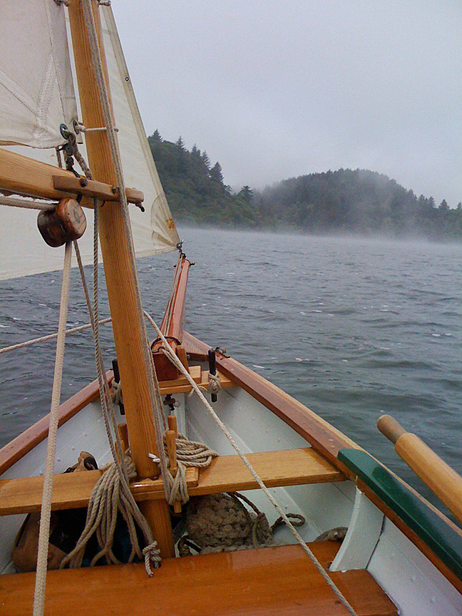 We reluctantly pack out on Sunday. Ace check the sails as Harvey rows towards the launching area in his skiff. |