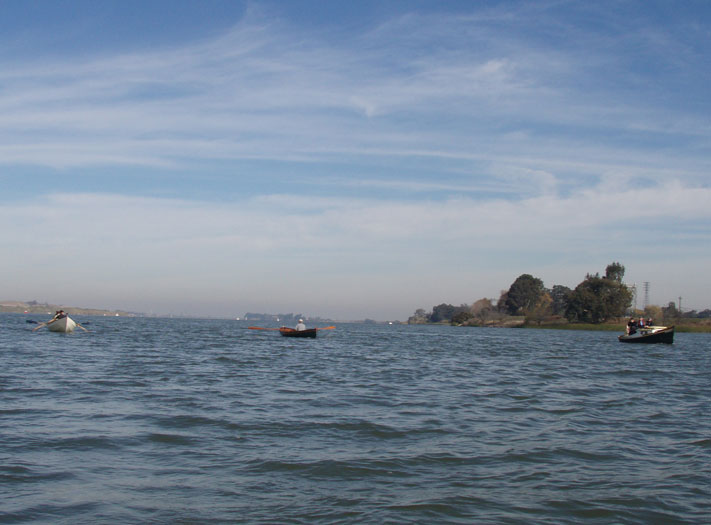 The lumpy water is all tide and currents, no wind. We have rowed out of the slough and into the main channel of the Sacramento just downstream from Rio Vista. Jim and Sunny's Redwing is off to port, keeping an eye on Ed Foster (her builder) rowing another of his boats in the center. | ||